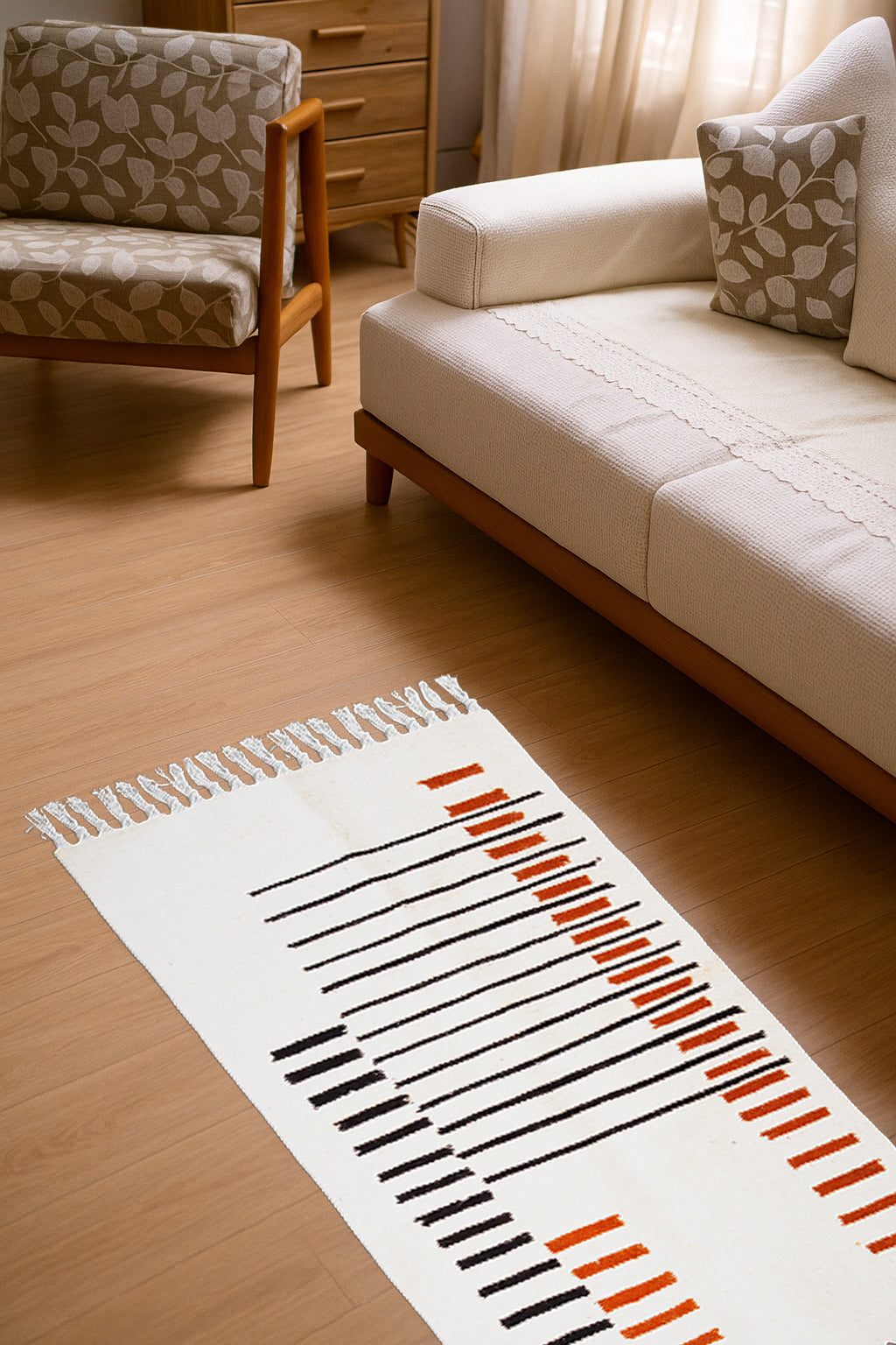 A 100% natural wool rug, masterfully handwoven with care. Its soft, heavy texture is built to withstand daily use, bringing comfort and warmth to any space. Perfectly suited for a variety of interiors and floor types.